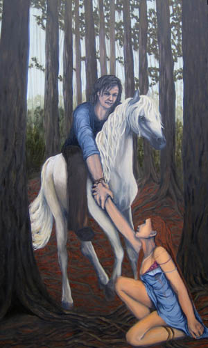 Zo verbolgen over haar lot begon ze steeds harder te huilen en had niet in de gaten dat er langzaam hoefgetrappel naderde. Ze schrok dan ook nogal toen ze ineens tegen de met modder besmeurde benen van een ooit wit paard aankeek. Ze keek met een ruk omhoog, midden in de wel heel blauwe ogen van een zeer aantrekkelijke man.