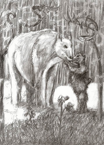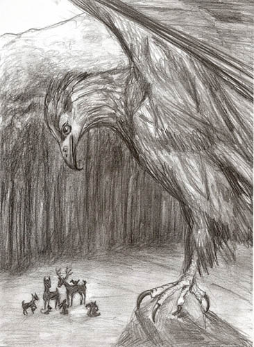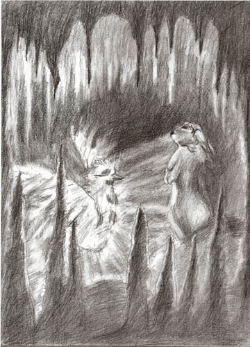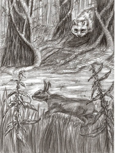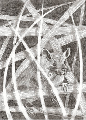 "... Mufje rilde en bibberde en was te verstijfd om te bewegen. Hesse twijfelde geen moment en in één hap bungelde ze aan haar staart tussen zijn tanden.