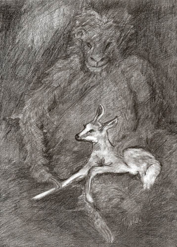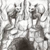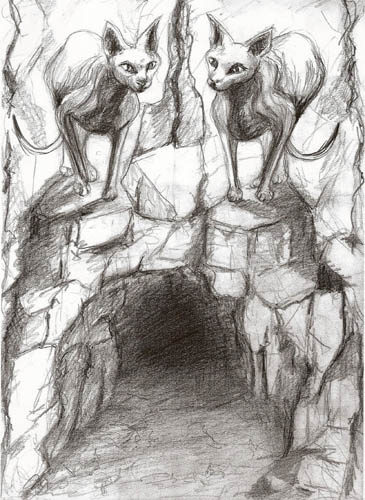 "Voor een grote donkere grot, zaten inderdaad twee grote katachtige tijgers op twee pilaren. Het was precies zoals in zijn droom.
